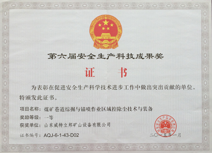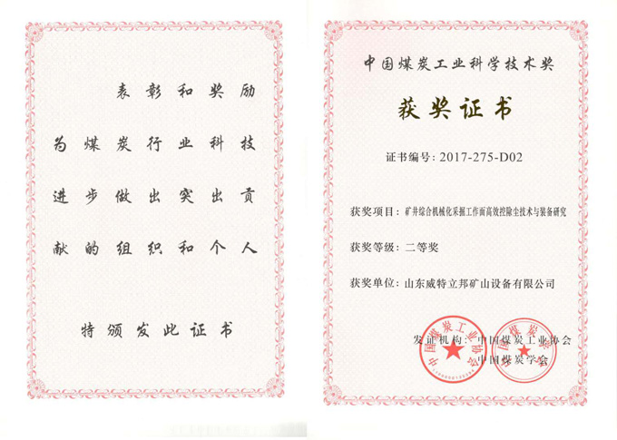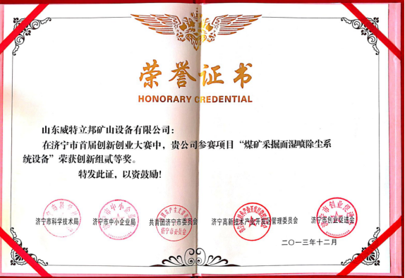 濟寧市首屆創(chuàng)新大賽“煤礦采掘面濕噴除塵系統設備”創(chuàng)新組二等獎