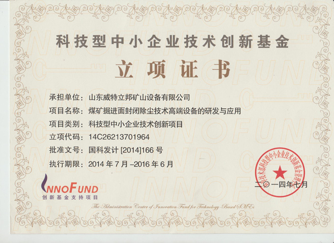 科技型中小企業(yè)技術創(chuàng)新基金立項證書